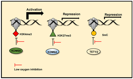 Chromatin oxygen sensing via JmjC histone demethylases and TETs. JmjC histone demethylases and TETs (mediators DNA demethylation) are 2-OGDs. Reduced activity of these enzymes in hypoxia, due to their oxygen sensitivity, can alter the chromatin landscape and mediate hypoxia induced transcription changes. Reduced activity of KDM5A in hypoxia increases H3K4me3 at the promoters of a subset hypoxia induced genes, facilitating their transcriptional activation. Reduced activity of KDM6A in hypoxia increases H3K27me3 at the promoters of a subset of hypoxia-repressed genes and represses their transcription. Reduced TET1/2 activity in hypoxia also represses gene transcription via DNA hypermethylation at gene promoters.
