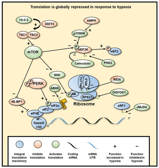 Hypoxia induces a global inhibition of protein translation. Global translation is mostly inhibited at initiation through mTOR inhibition of eIF4 and PERK inhibition of eIF2α, subsequently decreasing cap-dependent translation of mRNA. mTOR is inhibited through hypoxia-induced DDIT4-dependent release of TSC2 from 14-3-3 binding proteins, resulting in the inhibition of mTOR by TSC1/2 dimer. Elongation is also regulated through mTOR, as well as AMPK through its inhibition of RPS6KB1, wherein hypoxia eEF2K is not inhibited, which allows its phosphorylation and inhibition of eEF2. PHD2 can also hydroxylate eEF2K, which in normoxia causes its disassociation from calmodulin, decreasing its autophosphorylation. Termination is regulated by JMJD4-mediated hydroxylation of eRF1, which is required for termination. Selective translation of genes in hypoxia is regulated by UTR sequences, such as IRES and uORFs, which allow increased translation specifically in hypoxia. RNA binding proteins can bind to various parts of the mRNA and result in different regulatory outcomes. The ribosome can also be hydroxylated by RIOX1 and RIOX2, though it is not yet clear what role these modifications have.
