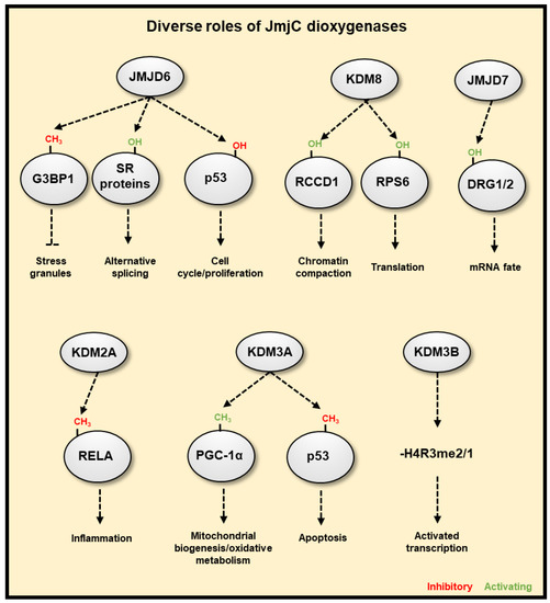 JmjC-domain containing 2OG dioxygenases have diverse cellular functions. JMJD6 is able to promote the formation of stress granules, which reversibly pauses transcript translation through demethylation of G3BP1. JMJD6 can hydroxylate splicing regulatory (SR) proteins, resulting in differential splicing or exon choice, such as skipping the first exon with the hydroxylation of SRSF11. JMJD6 can also hydroxylate p53 repressing its activity. KDM8 is an arginine hydroxylase that can target RCCD1 for chromatin condensation, and RPS6, which affects translation. JMJD7 is a lysyl hydroxylase that can target DRG1/2, affecting their regulation of RNA. KDM2A represses NF-κB activity via demethylation of RELA. KDM3A can demethylate both PGC-1α, promoting mitochondrial biogenesis, and p53, inhibiting its proapoptotic activity. KDM3B is able to demethylate mono- or di-methylated arginine residues, which functions to activate gene transcription.