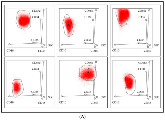 Acute lymphoblastic leukemia (ALL) is the most common pediatric malignant disease with an annual incidence of approximately 3.5/100,000 children worldwide; however, the overall 3-year survival rate can be as high as 87% if proper treatment is applied [1,2]. The 2016 modification of the World Health Organization (WHO) classification categories ALL based on recurrent genetic abnormalities which affect the characteristics of the disease and also determine the outcome and therapeutic decisions [3,4,5]. Besides genetic investigations, flow cytometry (FC) examination is a crucial part of establishing the diagnosis and later evaluating minimal residual disease (MRD) [6,7,8]. Furthermore, FC investigation, to some extent, is able to predict the presence of certain cytogenetic aberrations, as there are evidences of associations between the immunophenotype of pathological cells and cytogenetic aberrations, e.g., the absence of CD10 marker on abnormal lymphoblasts is associated with KMT2A gene rearrangement, and CD66c and CD25 positivity is associated with the presence of Philadelphia chromosome in ALL cases [9,10]. The expression of intracellular A subunit of coagulation factor XIII (FXIII-A) also needs to be mentioned here; though it is present in pathological B-cell lymphoblasts, the absence of this marker refers to the presence of a genetic subgroup belonging to the new provisional category of “B-other” genetic entity introduced by the WHO in 2016. Briefly, “B-other” group includes patients without recurrent genetic abnormalities, such as t(9;22)/BCR-ABL1, KMT2A (MLL) rearrangements, t(12;21)/ETV6-RUNX1, t(1;19)/TCF3-PBX1, or high hyperdiploidy [3,4,11,12]. The evaluation of MRD during induction therapy is proven to be an outstanding predictor of outcome, therefore it has a key role in risk-group stratification [13,14,15,16]. Even though the assessment of MRD was based on morphological examination initially [17], nowadays FC is recommended for this purpose, as—as proven by many working groups—it is as sensitive as a genetic method, and at the same time it is faster and more accessible. In order to become part of the diagnostic and follow-up protocols, FC method had to undergo thorough standardization [7,18,19,20,21]. The standardized FC method is based on well-defined antibody clones labelled with the recommended fluorochromes in 8 or 10-color settings, followed by conventional analysis, which uses bivariate dot-plots. In this case, we gain information about the expression of CD markers one by one, whether each antigen is expressed or not, and even if its presence is weak or bright positive [6]. The expression pattern of normal cells is well-known [22], so in each case, the interpreter compares the pattern observed to a normal one. This procedure requires remarkable experience, where the interpreters can recognize expression patterns and leukemia-associated immunophenotypes (LAIPs). In case of MRD detection, it is also a challenge to identify the abnormal cells in the regenerating bone marrow (BM), where all the stages of normal maturation are present during therapy; moreover, an immunophenotype shift of abnormal cells can also occur [23,24,25].