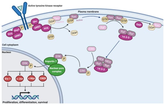 The MAPK cascade. Once a ligand binds the tyrosine kinase receptor, it self-phosphorylates [18]. This creates binding sites for Shc and Shp2. GRB2 can associate with either and then recruit SOS [19,20]. SOS is a guanine exchange factor for Ras and induces the exchange of GDP for GTP [21]. Now active Ras will dimerize and bind Raf [21]. After activating Raf, GTPase activating proteins (GAP) will hydrolyze the GTP to GDP to return Ras to its resting inactive state [22]. The active Raf dimers will recruit MEK [23], which then activates ERK [3]. ERK interacts with Importin 7 at the nuclear envelope to facilitate its entry through the nuclear pore complex into the nucleus [24,25]. Once inside, it phosphorylates multiple transcription factors to alter gene expression in the cell and induce proliferation and survival [26].