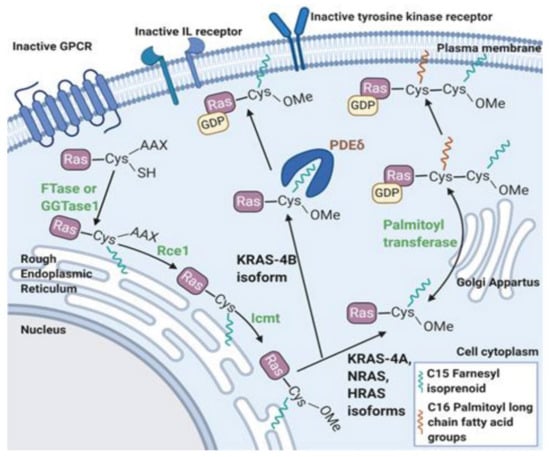Post translational farnesylation of Ras protein. The first modification is prenylation, preferentially performed by farnesyl transferase (FTase) [44]. This is initiated after recognition of the CaaX box on Ras’s C-terminus by FTase. Alternatively, the KRas-4B and NRas isoforms can be acted on by geranylgeranyl transferase 1 (GGTase1) if FTase is inhibited [43,45]. The farnesyl and geranylgeranyl moieties add enough hydrophobicity to enable Ras insertion into the endoplasmic reticulum membrane. Ras converting enzyme (Rce1) performs a final cleavage of the CaaX residues before isoprenylcysteine carboxyl methyltransferase (Icmt) adds a carboxymethyl group [44]. The final processing and transfer to the plasma membrane is isoform specific. Due to the farnesyl tail and a five amino acid sequence motif (Lys- Ser- Lys-Thr-Lys) in the C-terminus region, KRas-4B is directly chaperoned to the membrane by phosphodiesterase delta (PDEδ) [43,46,47]. Lacking the necessary motif, all other isoforms enter the Golgi apparatus for reversible palmitoylation by palmitoyl transferase. From the Golgi apparatus, HRas and NRas are trafficked to the plasma membrane on motile vesicles [48]. KRas-4A is trafficked by a poorly understood Golgi- independent route depending on mitochondrial function and class C vacuolar protein sorting (vps) proteins [49]. Afterwards, all isoforms associate with the membrane through their respective two-point anchors: the farnesyl modification and polybasic region of six lysines for KRas4b and the palmitoyl and farnesyl modifications for the other isoforms [50].