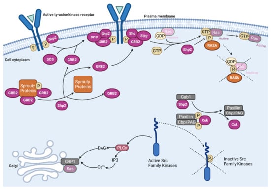 Grb2 can also associate with src homology region 2 domain-containing phosphatase 2′s (Shp2) [55] (Figure 3). This protein acts as a scaffolding protein, serving as a link to tyrosine kinase receptors via its two SH2 domains and Grb2 at its C terminus tail. It also has protein tyrosine phosphatase domain, which inactivates several negative regulators of the MAPK pathway [56]. Shp2′s dephosphorylation releases additional Grb2 molecules from sequestration by Sprouty family 1–2 proteins [57,58]. It also dephosphorylates Ras’ docking sites of RASA, a Ras GTPase activating protein (Ras-GAP) that accelerates the hydrolysis of Ras’ bound GTP. By preventing RASA’s binding, Ras-GTP accumulates and propagates its effects longer [59,60]. Shp2 also indirectly affects Ras’s signaling through the Src family kinases (SFK), cytosolic protein tyrosine kinases that play roles in cell proliferation and survival. Src proteins have two tyrosine sites that play a role in regulation. Auto dephosphorylation of Tyr416 contributes to Src activation, while Tyr527 phosphorylation by C-terminal Src kinase (Csk) is inhibitory [61]. Before it can inhibit SFKs, Csk activity is determined by the docking protein Paxillin and the Csk binding protein (Cbp). CBP is also known as the phosphoprotein associated with glycosphingolipid-enriched microdomains (PAG). When Shp2 is recruited by Gab1, it prevents the docking of Csk by dephosphorylating paxillin and Cbp/PAG. Csk molecules then dissociate from SFKs and allow them to propagate ERK signaling [62,63,64].