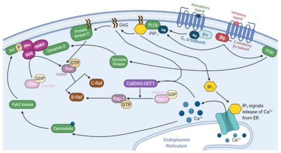 G protein-coupled receptor subunits Gαq and Gβγi interaction with the Ras-Raf pathway. G-proteins are heterotrimeric guanine nucleotide binding proteins with α-, β-, and γ-subunits. When a ligand binds to the extracellular portion of the receptor, it confers a guanine nucleotide exchange factor confirmation that induces the α-subunit to exchange its bound GDP to GTP. This causes the α-subunit to disassociate from the receptor and βγ- subunit. Both the α and βγ subunits effect changes in the cell, before the α subunit hydrolyzes the GTP and returns the receptor complex to its inactive state [94,95,107,108]. Both αq and βγi activate phospholipase C-β (PLCβ) to create the second messengers of diacylglycerol (DAG) and inositol-1,4,5-triphosphate (IP3) through the hydrolyzation of phosphatidylinositol 4,5-bisphosphate (PIP2) [109]. DAG activates PKC, which directly phosphorylates and activates Ras proteins [110,111]. IP3 stimulates the calmodulin pathway and Pyk2 kinase by way of inducing calcium release from the endoplasmic reticulum [112]. The resulting phosphorylation provides the base for Shc anchoring and recruitment of Ras’ guanine exchange factor complex [113]. Both DAG and IP3 play a role in allosterically controlling CalDAG-GEF1, a guanine exchange factor for Rap1 [94,114]. Once Rap1 has exchanged its bound GDP for GTP, it can activate BRaf in the place of Ras [115]. Furthermore, βγi activates phosphoinositide 3-kinase (PI3K), which augments cell signaling from tyrosine kinase receptors to increase Dynamin II [116], an additional anchor for Shc and Ras’ GEF complex [117,118,119].