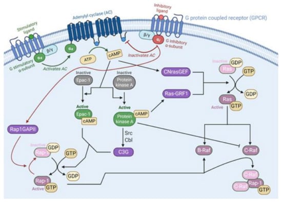 G-protein-coupled receptor subunits Gαs and Gαi interaction with the Ras-Raf pathway. When activated by a ligand, the GPCR is induced to exchange its bound GDP for GTP, freeing the α subunit to act on the cell. αs acts on adenylyl cyclase (AC) to increase the production of the second messenger cAMP from ATP [120]. In turn, cAMP activates Epac-1 [121] and protein kinase A [120]. Epac-1 and C3G, a downstream molecule from PKA, are guanine-nucleotide exchange factors for Rap-1 and induce the exchange of GDP to GTP to activate it [121,122]. Both activate Rap-1, which can modulate the activity of BRaf [115]. Protein Kinase A has other mechanisms of action as well. It can directly prevent the activation of CRaf through phosphorylation. Both activate Rap-1, which can modulate the activity of BRaf [115]. Protein kinase A has other mechanisms of action as well. It can directly prevent the activation of CRaf through phosphorylation [123]. It also activates a Ras GEF, RasGRF1, to start the MAPK cascade in certain cells [124]. In contrast, αi inhibits adenylyl cyclase and produces opposite effects. It also activates a Ras GEF, RasGRF1, to start the MAPK cascade in certain cells [124]. In contrast, αi inhibits adenylyl cyclase and produces opposite effects.