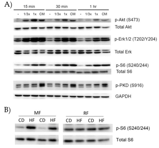 Soluble factors released from adipose tissue stimulate pro-oncogenic signaling pathways in pancreatic cancer cells. (A) Mesenteric adipose tissue from obese KC mice was harvested and cultured in vitro. Murine pancreatic cancer cells were incubated with the culture supernatant (undiluted (1×) or diluted (1/3×) for 15, 30, and 60 min and phosphorylation of pro-oncogenic signaling molecules detected by Western blotting. Total forms of the signaling molecules or glyceraldehyde 3-phosphate dehydrogenase (GAPDH) were used as loading controls. Serum-free culture medium (−) or complete culture medium with 10% fetal bovine serum (CM) served as negative and positive controls, respectively. (B) Mesenteric (MF) and retroperitoneal (RF) adipose tissues from obese (high fat: HF) or lean (control diet: CD) KC mice (n = 2 in each group) were harvested and cultured in vitro. Murine pancreatic cancer cells were incubated with the culture supernatant for 30 min and phosphorylation of S6 was measured by Western blotting. Total S6 served as a loading control. Data are authors’ own unpublished results.
