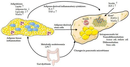 Changes in the gut microbiome, caused by genetic, environmental, or nutritional factors, are thought to influence the development of metabolic diseases and cancer by several mechanisms. These include microbiota-derived metabolites, e.g., short-chain fatty acids (mainly acetate, propionate, and butyrate), activation of intestinal GPCRs, or translocation of bacteria or bacterial components, e.g., lipopolysaccharide (LPS), enabled by an increase in gut permeability, leading to a systemic pro-inflammatory state [205]. It is well known that obesity is associated with elevated circulating LPS levels (metabolic endotoxemia) [226,227,228]. Animal models showed that obesity-associated metabolic endotoxemia induced AT inflammation through an LPS/toll-like receptor 4 (TLR4)-mediated mechanism [207,228,229]. Microbial alterations in PDAC featured an increase of certain pathogens and LPS-producing bacteria [230]. Although, to our knowledge, no studies have been published that directly measured LPS levels in the pancreas of obese subjects with PDAC, other reports using obese rats with deficiency in TLR4 have implicated an important role of LPS for the pancreatic β-cell function in [231]. Furthermore, exogenous administration of LPS to mice with oncogenic Kras expression in pancreatic acinar cells led to chronic pancreatitis and neoplastic PanIN formation [58]. In addition, besides direct action of LPS on PDAC cells [232], elevated LPS levels during obesity can also induce a shift of intrapancreatic resident macrophages and/or recruited monocytes into pro-inflammatory M1-like macrophages, which may promote PanIN development [80].