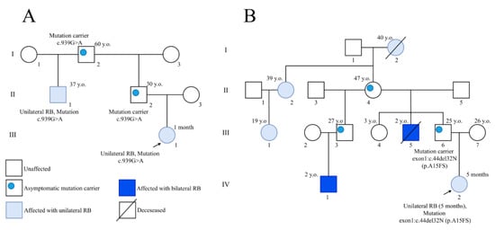 | Family # | Mutation | Mutation Type | Location | Retinoblastoma Form in the Proband | Parent—Asymptomatic Mutation Carrier |