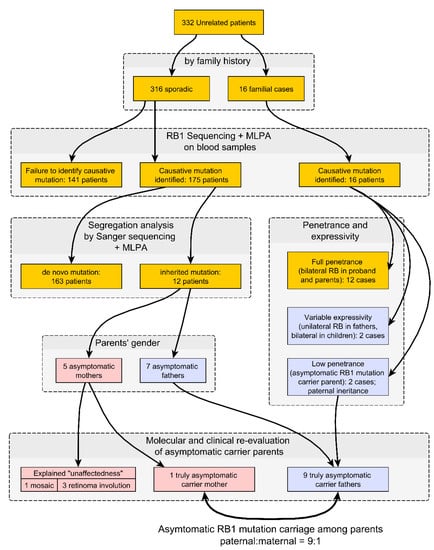 - Eloy, P.; Dehainault, C.; Sefta, M.; Aerts, I.; Doz, F.; Cassoux, N.; le Rouic, L.L.; Stoppa-Lyonnet, D.; Radvanyi, F.; Millot, G.A.; et al. A Parent-of-Origin Effect Impacts the Phenotype in Low Penetrance Retinoblastoma Families Segregating the c.1981C>T/p.Arg661Ttp Mutation of RB1. PLoS Genet. 2016, 12, e1005888. [Google Scholar] [CrossRef]