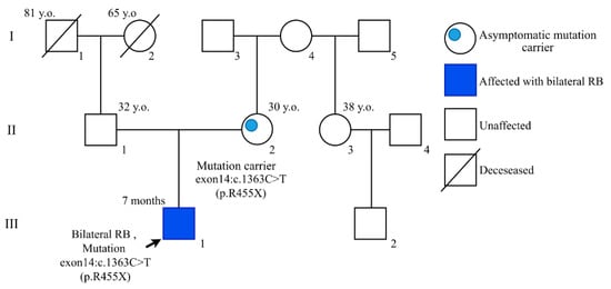 - Wu, S.; Zou, X.; Sun, Z.; Zhu, T.; Wei, X.; Sui, R. Unilateral retinocytoma associated with a variant in the RB1 gene. Mol. Genet. Genom. Med. 2020, 8, e1156. [Google Scholar] [CrossRef]