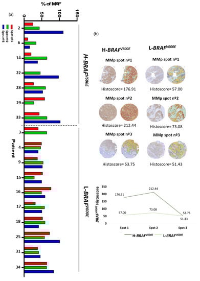 Striking differences in the MAF of BRAFV600E between spots of the same MMp were detected. Therefore, we decided to quantify such variations. First, to obtain the real BRAFV600E MAF we took into account the percentage (%) of tumoral cells present in each spot by three investigator-blinded assessments on H&E staining. Discrepant cases were discussed until an agreement was reached. Only spots composed of at least 50% tumor cells were considered. In all cases, the mean BRAFV600E MAF obtained by NGS was recalculated depending on the percentage of tumor cells observed in each spot from the TMA created. We defined H-BRAFV600E primary tumors as those that contained one spot with a two-fold increase MAF value regarding at least one of the other MMp spots. Samples that lacked this diversity were considered L-BRAFV600E. In our cohort of 17 MMp with the BRAFV600E mutation, 7 (41.18%) showed H-BRAFV600E while the remaining 10 (58.82%) had L-BRAFV600E (Figure 2a).