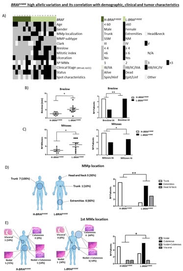 Clinicopathological characteristics of MMp depending on BRAFV600E MAF variation (high vs. low). (A) Heatmap showing demographic, clinical and tumor characteristics of MMp patients depending on BRAFV600E MAF variation. (B) Breslow thickness depending on BRAFV600E MAF variation and number of patients according to Breslow thickness (<4 mm vs. ≥4 mm) in primary melanoma tumors. (C) Number of mitoses and number of patients according to mitotic index (<6 vs. ≥6) depending on BRAFV600E MAF variation. (D) MMp and (E) first MMx location depending on H-BRAFV600E vs. L-BRAFV600E patients. Statistical analysis was performed using t-test, Fischer exact tests (* p < 0.05; ** p < 0.01).