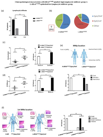 (a) Patient distribution according to variation of BRAFV600E MAF (high vs. low) and lymphocytic infiltrate degree of their primary melanoma spots. (b) Patient distribution according to variation of BRAFV600E MAF and the combination of their histophenotypic characteristics and lymphocytic infiltrate degree of the primary melanoma spots. (c) Breslow thickness depending on variation of BRAFV600E MAF, cytological characteristics and lymphocytic infiltration degree and number of patients according to Breslow thickness (<4 mm vs. ≥4 mm) in primary melanoma tumors. (d) Number of mitoses and number of patients according to mitotic index (<6 vs. ≥6) depending on variation of BRAFV600E MAF, cytological characteristics and lymphocytic infiltration degree. (e) MMp and (f) first MMx location depending on H-BRAFV600E/Spin/HInf vs. L-BRAFV600E/Epit/LInf patients. Statistical analysis was performed using t-test and Fischer exact tests (* p < 0.05; ** p < 0.01).