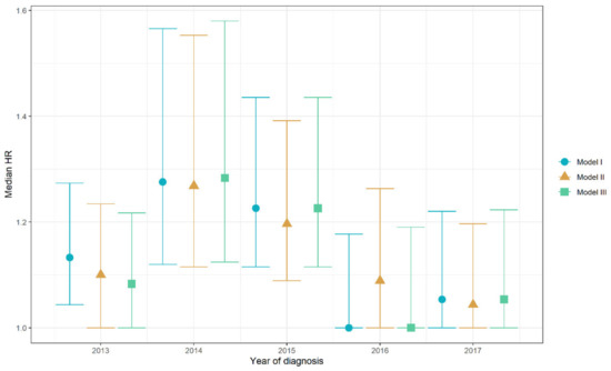 The degree of hospital variation between centers was expressed using median hazard ratios (mHRs). This concept has been described according to the methods by Austin et al. and can be interpreted as the median increase in hazard of mortality when comparing a patient at a hospital with higher mortality to a patient at a hospital with lower mortality [19]. The mHR was calculated and described by Austin et al., separately for each year of diagnosis for model I to III. Center variation was considered significant when the lower limit of the 95% confidence interval of the mHR was > 1.00.