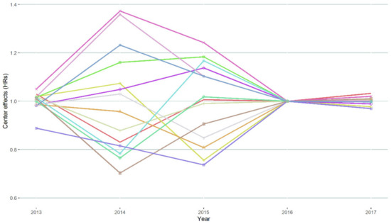 Between 2013 and 2017, 2-year survival probabilities increased from 29% to 44% for all centers together. Based on the mHR of model I to III, significant variation between centers in 2-year survival probabilities existed in 2014–2015, but there was no significant variation for patients diagnosed in 2013 and between 2016 and 2017 (Figure 1). Model-based center-specific HRs of the different centers corrected for case-mix covariates are shown in Figure 2. In the year with the largest variation (2014), between-center HRs ranged between 0.72 and 1.36 relative to the national average. Between 2013 and 2015, mHR was 1.13. Figure 3 shows the model III-based survival curves for a male 80-year-old reference patient with 1 × elevated LDH, an ECOG PS of ≥2 with 0–2 organ sites, no liver or brain metastases, and BRAFV600 wild-type tumor diagnosed in 2014 vs. the same patient diagnosed in 2016.