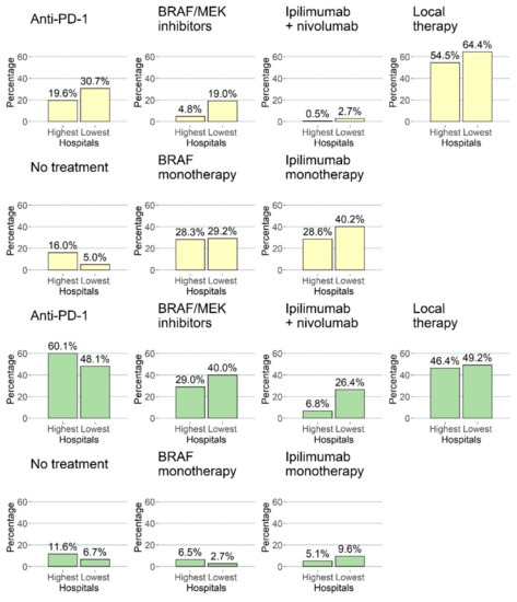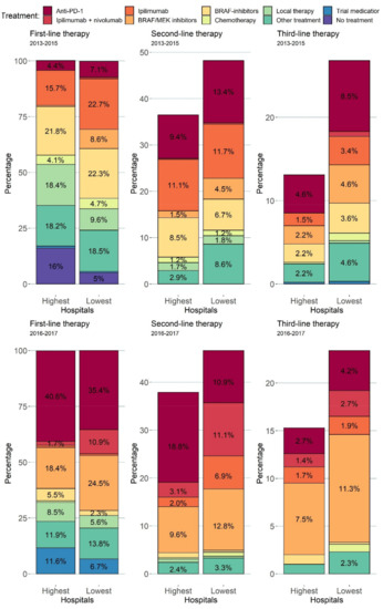 The current study shows that center variation in 2-year survival probabilities was only significant in patients diagnosed between 2014 and 2015. Approval and reimbursement of these new systemic therapies happened mainly in 2014–2015. However, some centers had access to these treatments before an official decision on reimbursement by participation in trials, compassionate use, or extended access programs, which might explain the variation in 2-year survival probabilities. The bar plots presented in this study show this effect, as the best performing centers have higher percentages of these new treatments in the first, second, and third line of anti-PD-1 antibodies (31% vs. 20%) and BRAF/MEK inhibitors (19% vs. 5%) between 2013 and 2015 (Figure 5). Over the years, this inequality in access has disappeared, resulting in complete access to these systemic treatment options in every melanoma center in the Netherlands. However, the percentage of patients treated with combination therapy of ipilimumab plus nivolumab remains different between the centers with the lowest and highest HRs (26% vs. 7%), but this does not lead to significant differences in 2-year survival. Future research should focus on current differences between centers in using combination therapy of ipilimumab plus nivolumab.