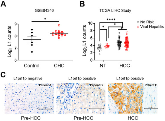 Human HCC RNAseq data were downloaded from The Cancer Genome Atlas Hepatocellular Carcinoma (TCGA-LIHC) project and RNAseq data of CHC patients and healthy controls GSE84346 were obtained from the NCBI GEO database. The reads were mapped to the human L1-Ta sequence (5′UTR-promoter, Genbank: L19092) by BLAT alignment using an in-house algorithm to obtain L1 counts (Python script can be provided upon request). The counts were normalised by the total number of reads in each library and expressed here as counts per million.