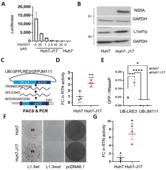 To evaluate the direct influence of HCV infection on L1 retrotransposition, Huh7-J17 cells stably expressing an HCV sub-genomic replicon (HCV genome without envelope proteins fused with the puromycin-resistance cassette and luciferase expression cassette) were employed [,]. Huh7-J17 cells were also positive for luciferase activity, which decreased upon treatment with PSI7977 (sofosbuvir, a NS5B polymerase inhibitor that inhibits virus replication) in a dose-dependent manner (Figure 2A), confirming the presence of the HCV replicon. The presence of the viral replicon was also further confirmed by Western blotting, showing the expression of the HCV NS5A protein (Figure 2B top panel and Figure S2). Similarly to CHC patient livers, upregulation of L1orf1p was observed in Huh7-J17 compared to Huh7 cells (Figure 2B bottom panel and Figure S2).