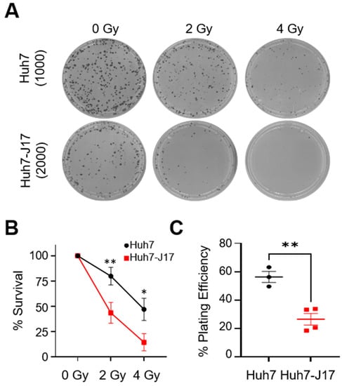 Since HCV is known to impair DNA repair mechanisms, we used a colonogenic assay to first compare the sensitivity of Huh7 and Huh7-J17 cells in response to a potent DNA damaging agent, i.e., ionising radiation (IR), which causes a complex spectrum of both DNA single-strand breaks (SSBs), as well as DSBs. Huh7-J17 cells were found to be significantly more sensitive to IR compared to parental Huh7 cells (Figure 3A,B). It is noteworthy that the non-irradiated colonogenic efficiency of Huh7-J17 cells was about half that of the parental Huh7 cells (~26% Huh7-J17 versus ~56% for Huh7), indicating an intrinsic stress in these cells due to the presence of HCV (Figure 3C).
