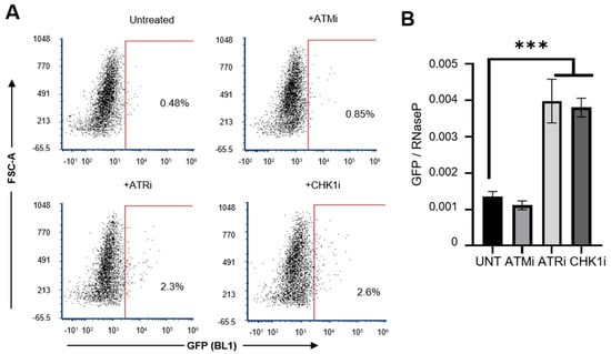We therefore examined the effect of blocking the DNA damage response enzymes on L1 retrotransposition frequencies in the Huh7 cell line using small molecule inhibitors that target ATM (KU-55933, 10 µM), ATR (VE-821, 1 µM) and CHK1 (SRA-737, 1 µM). A significant increase in L1 retrotransposition efficiency upon inhibition of ATR and CHK1 was observed in Huh7 cells (Figure 4A,B; effectiveness of the inhibitors against their respective targets is shown in Figure S6A,B). However, there was no influence on the L1orf1p level in Huh7 cells upon treatment with CHK1i (Figure S6C). ATR and CHK1 are known to play an important role in the maintenance of DNA integrity in the face of DNA damaging insults, principally through their involvement in the HRR response as well as cell cycle checkpoints []. This supports the hypothesis that the HRR pathway is the main DDR pathway involved in the regulation of L1-mediated genomic instability.