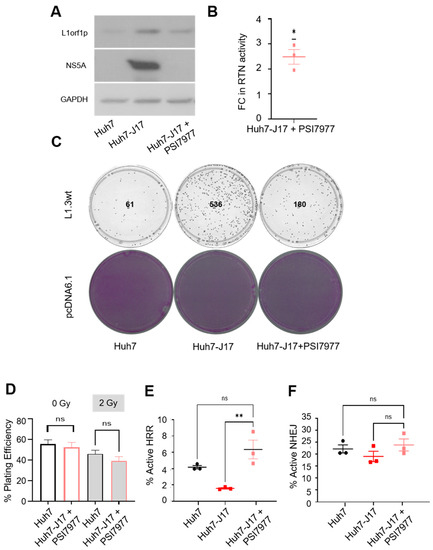Influence of HCV on L1 retrotransposition continues even after viral clearance. Western blot analysis on whole cell lysates of indicated cells to confirm the clearance of Hepatits C Virus (HCV) replicon and the L1orf1p level 3 weeks after treatment with 10 µM PSI7977. Tubulin was used as a loading control (A). Graph represents the fold change (FC) in the number of colonies representing active retrotransposition (RTN) in Huh7-J17+PSI7977 cells compared to Huh7 cells (B). Plates showing retrotransposition rates in indicated cell lines as assessed via blasticidin-based selection of resistant colonies. Image is representative of 3 independent repeats. Numbers represent number of colonies in the plate (C). Plating efficiency (%) of the indicated cells when exposed to 2 Gy X-rays or not (D). Graphs showing the percentage of GFP-positive cells representing active HRR (E) and NHEJ (F) repair in the indicated cell lines. ns = non-significant (p > 0.05), * p < 0.05, ** p < 0.01 by one-sample t-test (B), unpaired t-test (D) and one-way ANOVA (E,F). Detailed information about the Western blotting can be found in Figure S7. Key: L1orf1p = L1 open reading frame encoded protein; NS5A = nonstructural protein 5A; GAPDH = Glyceraldehyde 3-phosphate dehydrogenase.