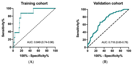 The ROC curves to determine predictivity of CIPI and overall survival are depicted for the training and validation cohorts. As shown in Figure 1A,B, the area under curve (AUC) was 0.849 (95% CI: 0.74–0.96; p = 0.001) in the training cohort and 0.718 (95% CI: 0.65–0.78; p < 0.0001) in the validation cohort, respectively. The results of X-tile analysis disclosed that the optimal cutoff level of CIPI in the training cohort was 302.0 (maximum high/low chi-square = 24.3955, Miller–Seigmund p < 0.0001). We defined the recommended cut-off value of CIPI as 300 for further validation analysis.