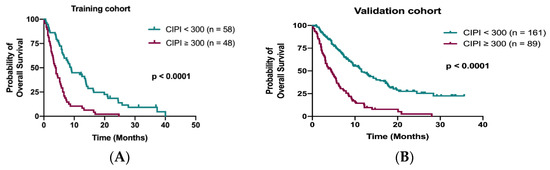 Kaplan–Meier curve for OS stratified by CIPI at 300 in the training cohort (A) and in the validation cohort (B).