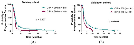 Kaplan–Meier curve for PFS stratified by CIPI at 300 in the training cohort (A) and in the validation cohort (B).