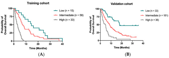 Kaplan–Meier curve for OS stratified by the scoring model in the training cohort (A) and in the validation (B).