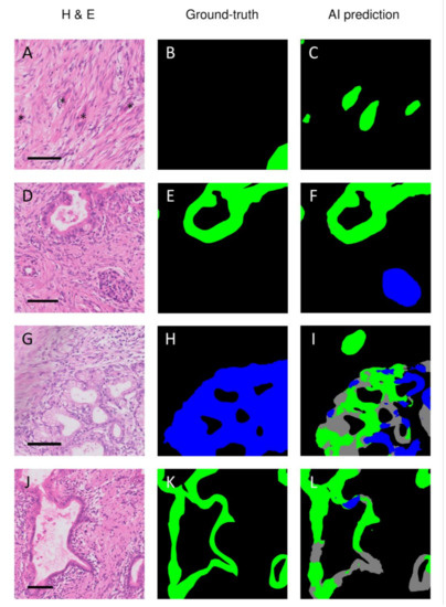 Discrepancies between the ground truth annotations and AI-based prediction of pancreatic ductal adenocarcinoma. Legend: The network frequently correctly recognized structures that were missed during annotating, such as tumor buds (A–C) or islets of Langerhans (D–F). The neural network also made classification errors, such as classifying atrophic metaplastic epithelium as either normal or tumorous ducts (G–I) or classifying tumor ducts as being normal (J–L). H&E = hematoxylin and eosin; Ground-truth = annotations by the pathologist; AI prediction = prediction by the artificial intelligence model; green = cancerous ducts and in situ neoplasia; gray = normal ducts; blue = remaining non-tumorous epithelial tissue. The asterisks in A indicate cancerous tissue that was missed during the annotation process. The scale bar indicates a length of 100 µm.