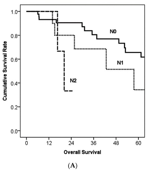 With a median follow-up period of 30.3 months, the median disease-free survival was 30.9 months, and the median overall survival was 78.8 months (Figure 1). Five-year disease-free survival and overall survival rates were 38.5% and 57.4%, respectively (Figure 1). Figure 2 shows survival comparisons according to cancer staging of the exocrine pancreatic tumor of the AJCC 8th edition. While N2 regional lymph node metastasis showed poorer prognosis than N0 (p = 0.011), N0 and N1 did not reflect survival differences (Figure 2A). In patients without regional lymph node metastasis (N0), T stage did not show survival differences between each stage (Figure 2B). The median survival was 77.4 months in stage IA, not reached in stage IB, 78.8 months in stage IIA, 57.6 months in stage IIB, and 20.2 months in stage III (Figure 2C).