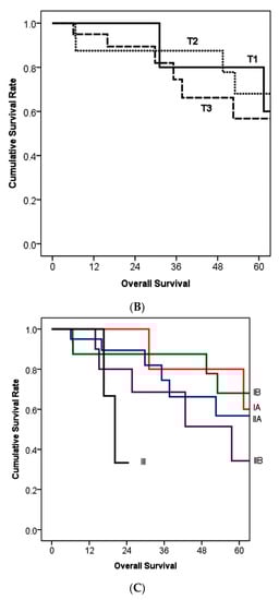 Kaplan–Meier survival curves according to the American Joint Committee on Cancer staging [14]. (A) When the analysis considered N stage (n = 59), there was a significant difference between N0 and N2 (p = 0.011), although there was no significant difference in comparison of N0 vs. N1 (p = 0.246) or N1 vs. N2 (p = 0.219). The median survival was 96.3 months in N0, 57.6 months in N1, and 20.2 months in N2. (B) When the analysis considered T stage in N0 patients (n = 44), there was no significant difference between T stages (p = 0.604 for T1 vs. T2, p = 0.263 for T2 vs. T3, and p = 0.729 for T1 vs. T3). The median survival was 77.5 months in T1, not reached in T2, and 78.8 months in T3. (C) The median survival was 77.4 months in stage IA, not reached in stage IB, 78.8 months in stage IIA, 57.6 months in stage IIB, and 20.2 months in stage III. Stage III showed significant differences with other stages (p = 0.21 for IA vs. III and p = 0.39 for IIA vs. III).