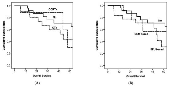 In terms of adjuvant therapy, the kind of therapeutic modality did not show significant survival differences (Figure 3A). Although gemcitabine (GEM)-based chemotherapy did not show significant survival difference compared with no therapy (p = 0.518) or compared with 5-fluorouracil (5-FU)-based chemotherapy (p = 0.196), 5-fluorouracil-based chemotherapy showed poorer survival than no adjuvant therapy (p = 0.035, Figure 3B).