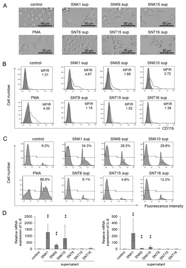 Macrophage-like differentiation and activation were promoted by the supernatants of EBV-positive NK-cell lines to THP-1 cells. THP-1 cells were co-cultured with each supernatant of EBV-positive T- or NK-cell lines for 72 h. After the co-culture, the target cells were subjected to each assay. The same amount of culture media of EBV-positive T- or NK-cell lines was added as an untreated control. PMA, a cell differentiation regulator, was used as a positive control. (A) The representative morphology of THP-1 cells was photographed by an optical microscope. (B) The CD11b expression on THP-1 cells was determined by flow cytometry using an antibody to CD11b (open histogram) or isotype-matched control (gray, shaded histogram). The mean fluorescent intensity of CD11b was normalized by the mean of isotype-matched control and is shown as the MFIR (mean fluorescence intensity rate). (C) The phagocytosis ability of THP-1 cells was examined by a fluorescent beads uptake assay. After co-culturing with each supernatant, THP-1 cells were incubated with the fluorescent beads for 4 h, and the uptake of these beads was detected by flow cytometry. The rate of fluorescence intensity positive was estimated as phagocytosis ability. (D) The mRNA expression of IL-6 and IL-8 in THP-1 cells was analyzed by qRT-PCR assay. The expression was normalized to GAPDH mRNA. The data are shown as the mean ± SD (n = 3). Statistical analyses were assessed and indicated as ** p < 0.01 compared to the control.