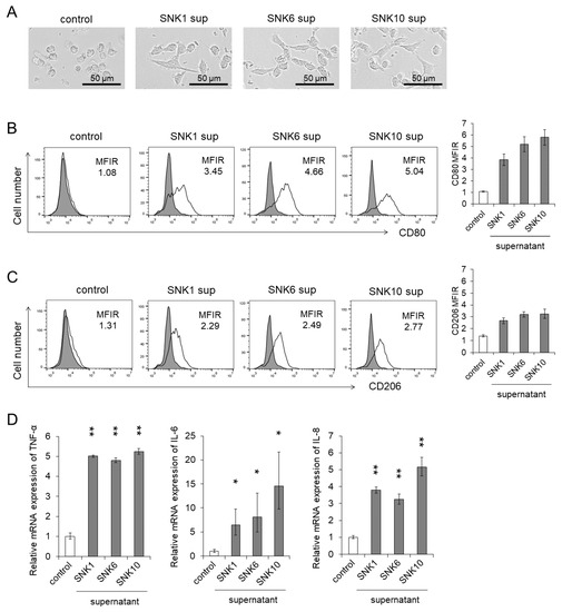 The differentiation of human monocytes to macrophages and activation were promoted by the supernatants of EBV-positive NK-cell lines. Human monocytes were co-cultured with each supernatant of EBV-positive NK-cell lines for 24 h. The same amount of culture media of EBV-positive NK-cell lines was added as an untreated control. After the co-culture, the target cells were subjected to each assay. (A) A representative morphology of human monocytes was pictured using an optical microscope. (B,C) The CD80 and CD206 expression on human monocytes was determined by flow cytometry. The representative figure is shown on the left panel indicating CD80 and CD206 (open histogram) or isotype-matched control (gray, shaded histogram). The mean fluorescent intensity of CD80 and CD206 was normalized by that of isotype-matched control and expressed as MFIR. (D) The mRNA expression of TNF-α, IL-6 and IL-8 in human monocytes was analyzed by qRT-PCR assay. The expression was normalized to GAPDH mRNA. The data are shown as the mean ± SD of three independent healthy donors (n = 3). Significant differences are indicated as * p < 0.05 and ** p < 0.01 compared to the control.
