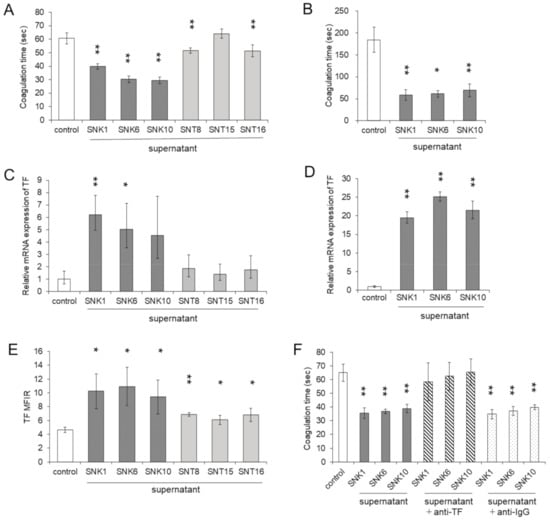 Procoagulant activity was enhanced by the supernatants of EBV-positive NK-cell lines. THP-1 cells and human monocytes were co-cultured with each supernatant of EBV-positive T- or NK- cell lines for 24 h. The same amount of culture media of EBV-positive T- or NK-cell lines was added as an untreated control. After the co-culture, the target cells were subjected to each assay. (A) The procoagulant activity (PCA) on THP-1 cells was measured by normal plasma-based recalcification time (n = 6). The shortening of coagulation time indicates increased the PCA. (B) The PCA on human monocytes of three independent healthy donors was measured (n = 3). (C) The mRNA expression of the tissue factor (TF) in THP-1 cells was examined by qRT-PCR (n = 3). The expression was normalized to GAPDH mRNA. (D) The mRNA expression of TF in human monocytes of three independent healthy donors was measured (n = 3). (E) The cell surface TF antigen on THP-1 cells was analyzed by flow cytometry using an antibody to TF or isotype-matched control. The mean fluorescent intensity of TF was normalized by that of isotype-matched control and expressed as MFIR (n = 4). (F) To investigate the effects of cell surface TF on PCA, THP-1 cells were treated with mouse monoclonal anti-human TF antibody or the same amount of irrelevant IgG. After the treatment of antibody, the cell surface PCA was assessed (n = 4). The data are shown as the mean ± SD. Statistical analyses were assessed and are indicated as * p < 0.05 and ** p < 0.01 compared to the control.