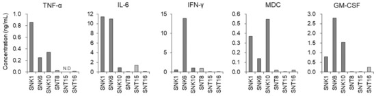 These results indicate that some humoral factors, which are produced and secreted by EBV-NK-cells, may be contributing to the activation of PCA and the differentiation to macrophages of monocytes. To prove our hypothesis, we investigated which humoral factors influenced the effects on monocytes. Since the levels of inflammatory cytokines increased in the plasma of EBV-positive T- or NK-cell neoplasms [11,12,18], we performed cytokine multiplex analysis to identify the responsible cytokines for the differentiation and the activation of monocytes (Figure S3).We detected five proinflammatory cytokines, TNF-α, IL-6, IFN-γ, MDC, and GM-CSF, which showed remarkably high levels in the supernatants of EBV-NK-cell lines compared to those in the supernatants of EBV-T-cell lines (Figure 4).