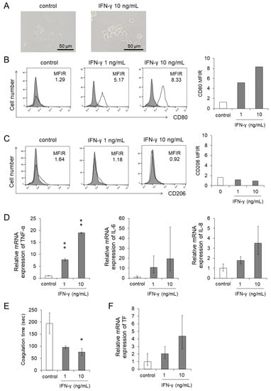 Differentiation and procoagulant activity were promoted by the stimulation of IFN-γ. Human monocytes were treated with recombinant IFN-γ for 24 h. The same amount of culture media of EBV-positive T- or NK-cell lines was added as an untreated control. After the treatment, the target cells were subjected to each assay. (A) The representative morphology was pictured using an optical microscope. (B,C) The CD80 (B) and CD206 (C) expression on human monocytes was determined by flow cytometry. The representative figure is shown on the left panel indicating CD80 and CD206 (open histogram) or isotype-matched control (gray, shaded histogram). The mean fluorescent intensity of CD80 and CD206 was normalized by that of isotype-matched control and expressed as MFIR. (D,F) The mRNA expression of TNF-α, IL-6, IL-8 (D), and TF (F) in human monocytes was analyzed by qRT-PCR assay (n = 3). The expression was normalized to GAPDH mRNA. (E) The PCA on human monocytes was measured using the normal plasma-based recalcification time (n = 3). Shortening of the coagulation time indicates increased PCA. The data are shown as the mean ± SD of three independent healthy donors. Statistical analyses are assessed and indicated as * p < 0.05 and ** p < 0.01 compared to the control.