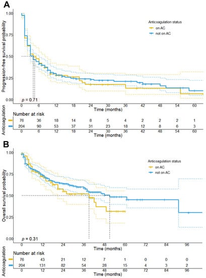 Progression-free and overall survival in patients stratified by the concomitant treatment with anticoagulants. Results show that patients receiving AC during initial ICI therapy did not have a significantly shorter PFS compared to patients not on AC (median PFS 4.0; 95% CI: 1.7–6.3 months vs. 4.0 months; 95% CI: 2.9–5.1 months; p = 0.705) (A). Neither did patients on AC show a significantly worse OS as compared to patients not on AC (median OS: 39.0; 95% CI: 18.4–59.6 months vs. 51.0 months; 95% CI: 30.6–71.3 months; p = 0.31), although there was a trend towards a shorter OS in this cohort of patients (B). The bold is used for the title of the figures.