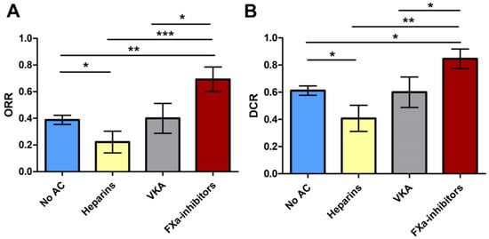 Bar chart showing the objective response rate (A) and disease control rate upon initial ICI therapy (B) stratified by the category of concomitant AC treatment. Patients receiving concomitant treatment with FXa inhibitors showed a significantly higher ORR and DCR as compared to other AC agents, such as heparins or vitamin K antagonists (VKA), as well as patients not receiving AC. Notably, patients on heparin treatment presented with the worst ORR and DCR as compared to the other categories. Abbreviations: * p < 0.05, ** p < 0.005, *** p < 0.001.