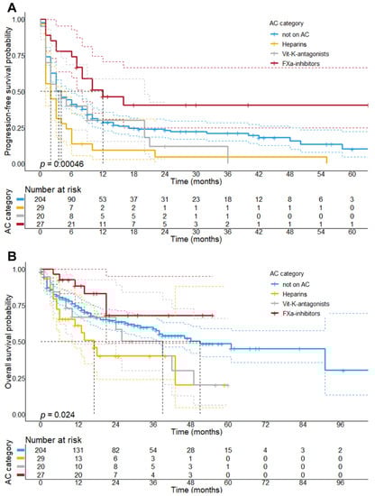 Progression-free and overall survival of patients stratified by the category of concomitant anticoagulation. Results revealed that PFS (p = 0.00046) and OS (p = 0.024) of patients undergoing initial ICI therapy significantly differed depending on the class of concomitant AC (p-values indicate statistically significant differences between the groups tested in this model). Particularly, patients receiving FXa-inhibitors (FXa-i) presented with the best PFS (median: 12 months) as compared to patients given heparins or VKA (median PFS: 2 and 3 months) during initial ICI therapy (p < 0.001). Further, patients not on AC did show a longer PFS compared to patients treated with heparins (p = 0.003), but a worse PFS as compared to patients receiving FXa-i (p = 0.016) (A). Log-rank test comparing the OS of patients stratified by AC category revealed a significantly shorter OS of patients receiving heparin treatment (median OS: 17.0 months, 95% CI: 10.6–23.4 months, p = 0.03), whereas concomitant treatment with VKA (median OS: 39 months; 95% CI: 16.8–61.2 months, p = 0.19) or FXa-i (median OS: not reached, p = 0.15) did not differ from patients not on AC (median OS: 51 months; 95% CI: 30.6–71.3 months) (B).The bold has been used for the image caption title.