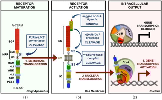Main framework of canonical Notch signal transduction. (a) Notch receptors are synthetized as monomeric precursor proteins, which are subjected to a proteolytic cleavage by furin-like convertases (S1) in the Golgi apparatus before being exposed to the cell membrane as non-covalently linked heterodimers. From the N- to the C-terminal, the mammalian Notch proteins comprises: EGF (epidermal growth factor-like repeats), NRR (negative regulatory region), LNR (Lin12/Notch repeats), HD (heterodimerization domain), RAM (RBP-jk associated molecule), NLS (nuclear localization signal), ANK (ankyrin repeats), TAD (transactivation domain), and PEST (proline, glutamic acid, serine, and threonine). (b) The interaction of a Jagged or DLL (Delta-like ligand) family ligand to the EC (extracellular fragment) of the trans-membrane Notch receptor leads to the S2 cleavage of the receptor by ADAM10/17 (a disintegrin and metalloproteinase) and the subsequent S3 proteolysis catalyzed by the γ-secretase complex. This last cleavage releases from the membrane the IC (intracellular fragment) of Notch, which translocates to the nucleus. (c) In the absence of Notch, the transcription factor CSL (CBF-1/SuH/Lag-1 DNA-binding protein), in association with several Co-R (co-repressors factors) and HDACs (histone deacetylases) on the regulatory regions of Notch target genes, acts as a transcriptional repressor. The binding of the Notch IC to CSL displaces from CSL the Co-R, and by recruiting MAML (Mastermind-like), p300, and distinct context-related Co-A (co-activators factors), target genes’ transcription is switched to an activated state.