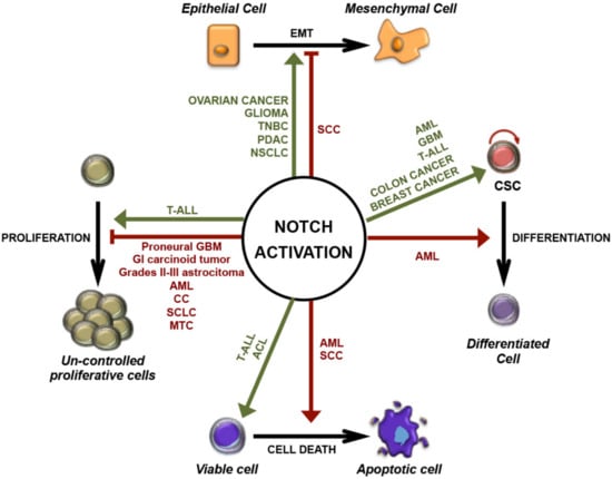 Pleiotropic functions of Notch activation in cancer. Schematic representation of oncogenic (green) and tumor-suppressive (red) roles of Notch signaling in different cancers: stimulation or inhibition of uncontrolled proliferation; regulation of epithelial-mesenchymal transition (EMT); induction of differentiation or maintenance of cancer stem cells (CSCs); promotion of cell survival or cell death. ACL: lung adenocarcinoma; AML: acute myeloid leukemia; CC: cervical cancer; GI: gastrointestinal; GBM: glioblastoma multiforme; MTC: medullary thyroid carcinoma; NSCLC: non-small-cell lung cancer; PDAC: pancreatic ductal adenocarcinoma; SCLC: small-cell lung cancer; SCC: squamous cell carcinoma; T-ALL: T-cell acute lymphoblastic leukemia; TNBC: triple-negative breast cancer.