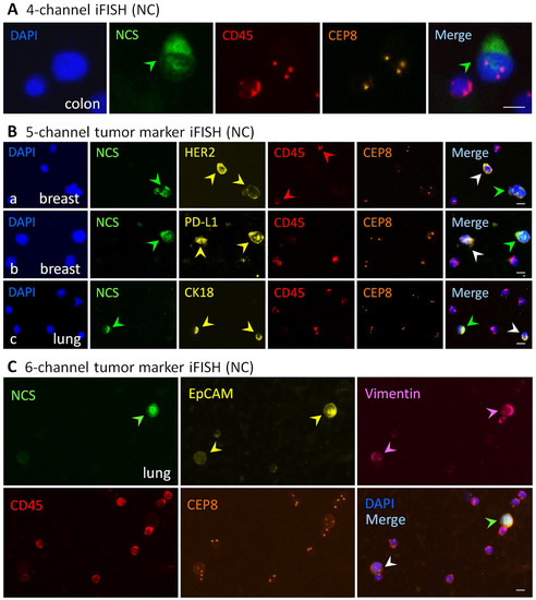 Representative images of viable and necrotic aneuploid cancer cells identified by the multi-channel iFISH (NC) are demonstrated in Figure 1. Shown in Figure 1A, 4-channel iFISH (NC) reveals a dead triploid SW480 colon cancer cell showing positive necrotic cell staining (NCS) and a viable WBC (negative for NCS). Figure 1B (5-channel iFISH (NC)) displays mono-tumor marker positive cancer cells, including a necrotic cell cluster consisting of three HER2+ haploid SK-BR-3 breast cancer cells and a viable HER2+ haploid breast cancer cell (Figure 1B(a)), a necrotic PD-L1+ diploid/near-diploid [27,33] and a viable PD-L1+ diploid/near-diploid MDA-MB-231 breast cancer cells (Figure 1B(b)), a necrotic CK18+ triploid and a viable CK18+ triploid A549 lung cancer cells (Figure 1B(c)). Figure 1C (dual-tumor marker 6-channel iFISH (NC)) illustrates viable and necrotic A549 NSCLC cells possessing the intermediate hybrid epithelial (E)/mesenchymal (M) phenotype [34], showing a necrotic EpCAMhigh+/Vimentin+ triploid and a viable EpCAMlow+/Vimentin+ triploid lung cancer cells. The highly heterogeneous expression of EpCAM on NSCLC cells revealed in this study keeps in accordance with that previously reported by others and us [19,35]. All the illustrated WBCs are live cells, indicating that high viability of cells was consistently maintained following SE enrichment processing [22].