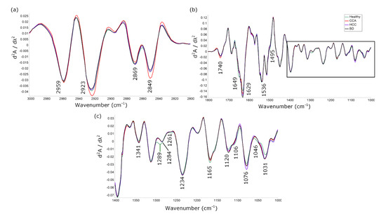 3.1. Characteristic Peaks of Healthy, CCA, HCC and BD Spectra