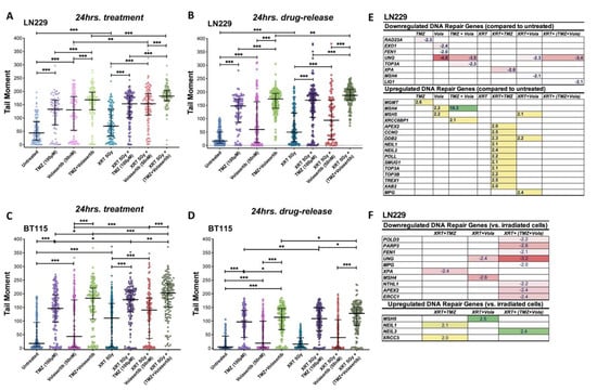 - Boccard, S.G.; Marand, S.V.; Geraci, S.; Pycroft, L.; Berger, F.R.; Pelletier, L.A. Inhibition of DNA-repair genes Ercc1 and Mgmt enhances temozolomide efficacy in gliomas treatment: A pre-clinical study. Oncotarget 2015, 6, 29456–29468. [Google Scholar] [CrossRef] [PubMed] [Green Version]
