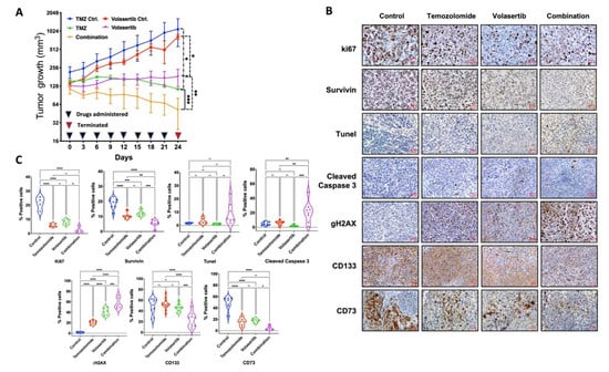 3.6. Combined Treatment of Volasertib and TMZ Reduces Tumor Growth and Stemness and Increases DNA Damage and Apoptotic Cell Death in Glioblastoma Cells In Vivo