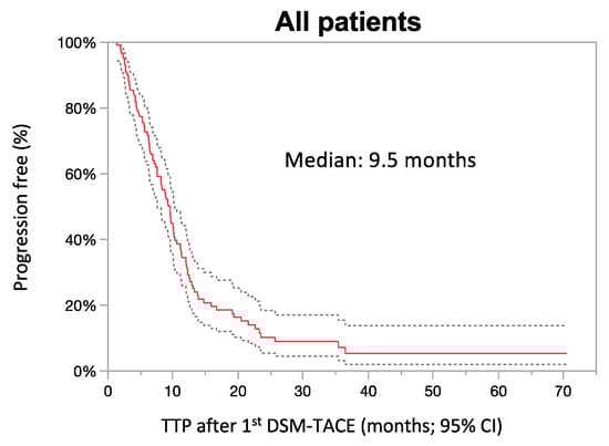 - Schicho, A.; Pereira, P.L.; Haimerl, M.; Niessen, C.; Michalik, K.; Beyer, L.P.; Stroszczynski, C.; Wiggermann, P. Transarterial chemoembolization (TACE) with degradable starch microspheres (DSM) in hepatocellular carcinoma (HCC): Multi-center results on safety and efficacy. Oncotarget 2017, 8, 72613–72620. [Google Scholar] [CrossRef] [Green Version]