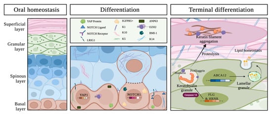 Schematic representation (original figure) of the oral layers in homeostasis (left) with a highlight of the basal layer depicting major players in epithelial differentiation (middle) and those regulating terminal differentiation in the superficial layer (right).