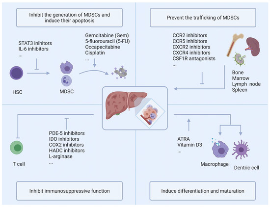 Firstly, depletion of MDSCs could be achieved by the application of classical chemotherapeutics. The role of chemotherapeutic agents on immune responses is complicated. Some agents have been found to eliminate MDSCs in circulation and tumors, such as gemcitabine (Gem), 5-fluorouracil (5-FU), oxaliplatin, and capecitabine [85,86,87,88]. However, most HCC patients are not sensitive to chemotherapy due to drug resistance. Excessive chemotherapy may even inhibit the immune system, leading to adverse consequences such as liver parenchyma injury, reduced compensatory function of cirrhosis, and tumor progression [89].